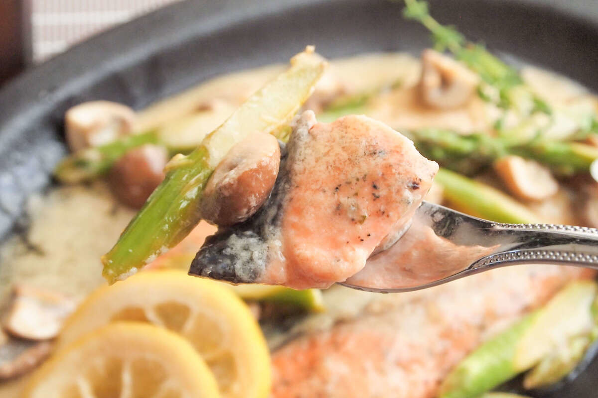 一口食べると、レモンの酸味が効いたソースで、見た目に反しすごくさっぱりしています。サーモンはもちろん、マッシュルームやアスパラもこのソースと相性ピッタリ!