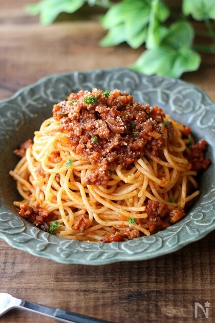 トマトの旨味溢れる本格ミートソースパスタです。冷凍保存も可能なので、多めに作っておくと便利ですよ。パスタ以外にも、タコライスやミートグラタン、オムライスソースなどに応用できます。