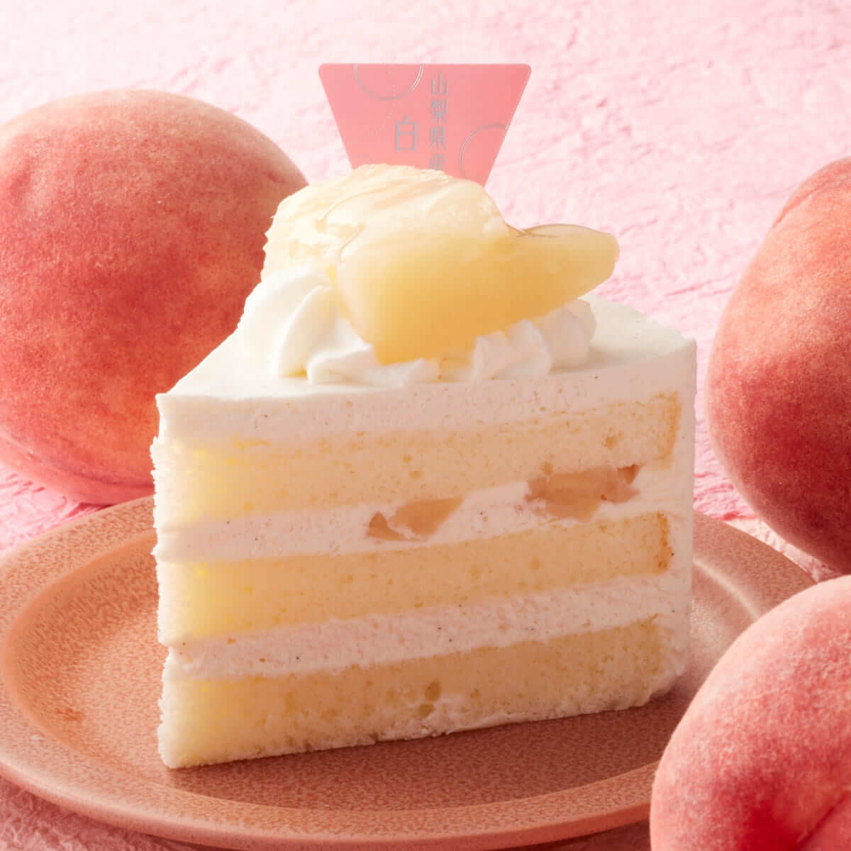 10日間しか店頭に並ばないフェア限定のケーキには、太陽の光をいっぱいに浴び、樹上で完熟を迎えた柔らかい果肉と糖度の高さが特徴の「完熟桃」を使用。