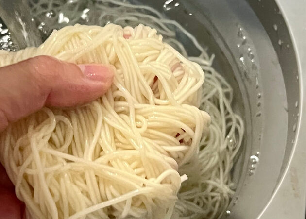 再び煮立ってきたらそうめんをざるに上げて、流水で冷まします。そうめんが完全に冷めたら、流水でもみ洗いする感覚で洗うのがポイント!