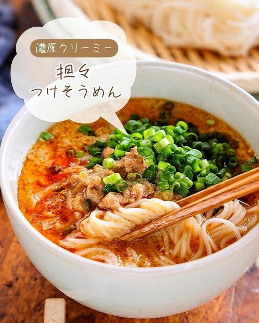 そうめんは担々麺風のアレンジにしてもおいしいです。クリーミーでピリッと辛いスープは、お肉も野菜もたっぷり入って具だくさん。きりっと冷やしたそうめんを、熱々の汁につけて食べれば、もう絶品です。