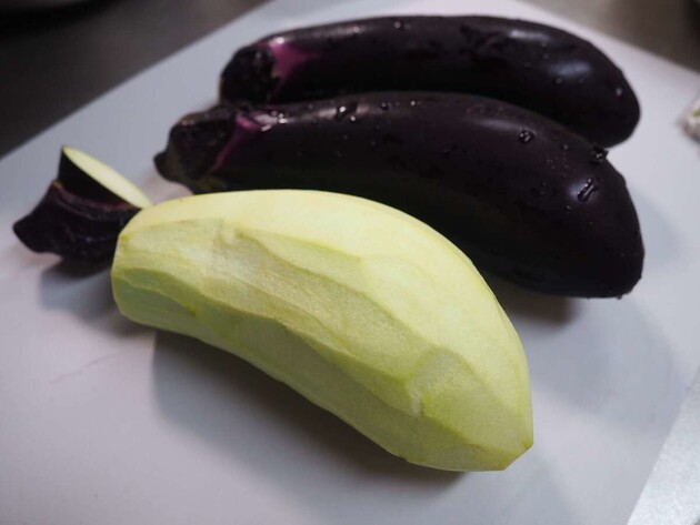 ①なすのヘタを切り落とし、ピーラーで皮を剥く