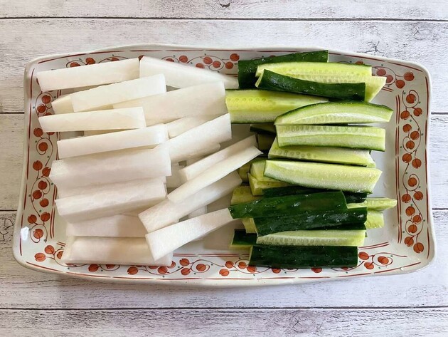 【1】きゅうりと皮をむいた大根をスティック状に切る。