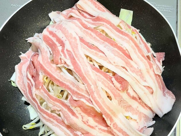 【2】フライパンにキャベツ→もやし→豚バラ薄切りの順に重ねていく。