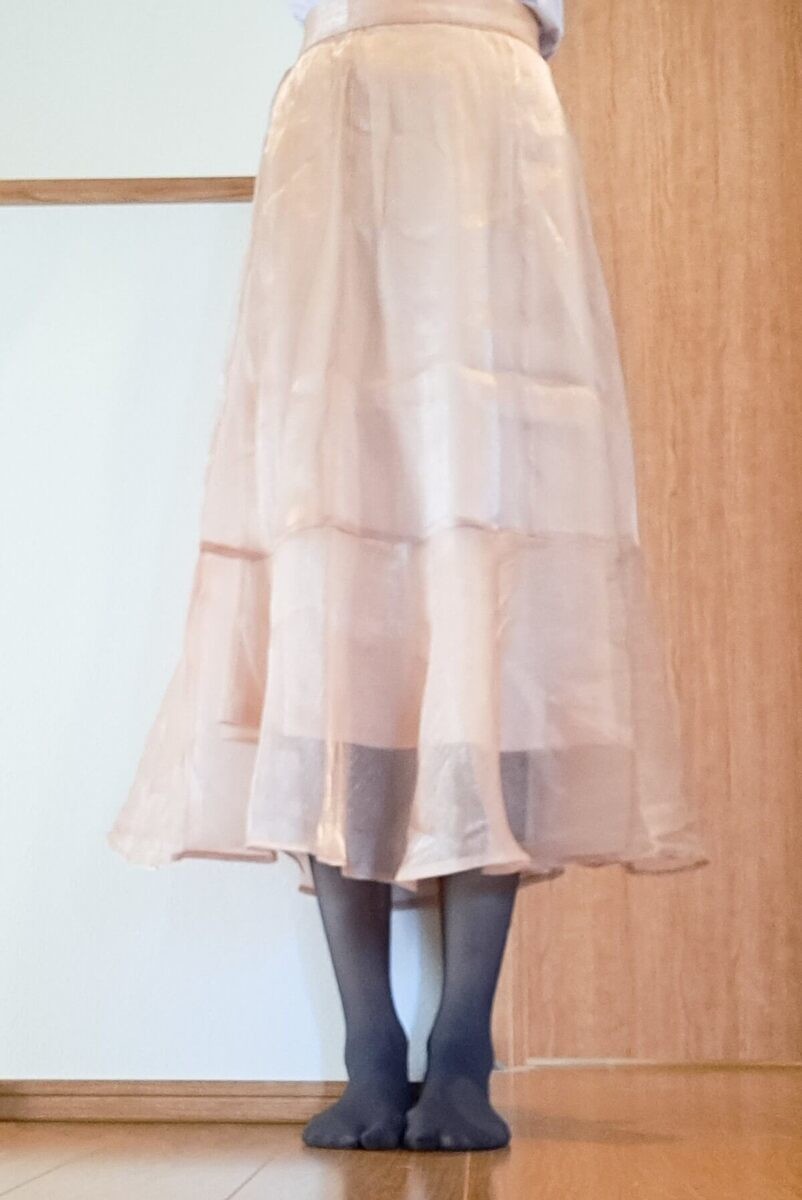 ピンクのシアースカートと合わせれば、同じく涼しげな印象に。ロングスカートには靴下を合わせることが多かったのですが、脚を露出したくない日はシアータビストッキングと合わせています。
