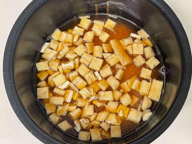 炊飯器の内釜に洗った米を入れ、切った油揚げをのせたら【A】を注いで普通炊きします。