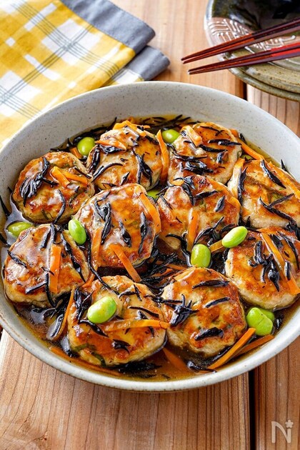 ふわふわの豆腐ハンバーグに、ひじきの和風あんをたっぷり絡めた、ほっこり優しい味わいな一品です。食欲がないときでも食べやすく、栄養バランスも◎。