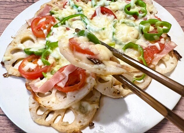 いつものピザのように何等分かに分けなくても、スライスしたレンコンごとに分けて食べられるところも便利!