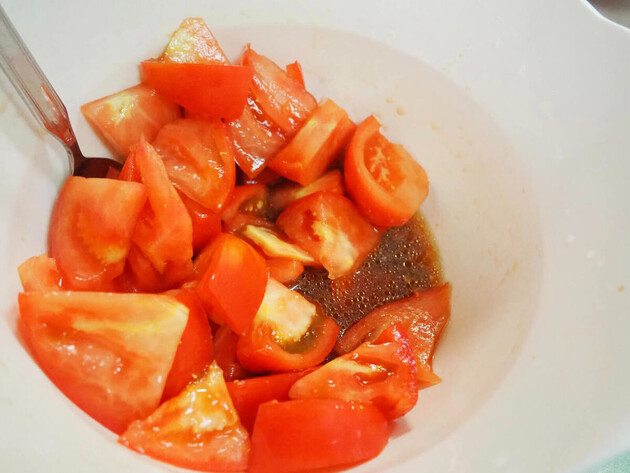 カットしたトマトと調味料をボウルに入れ、ざっくりと混ぜ合わせます。