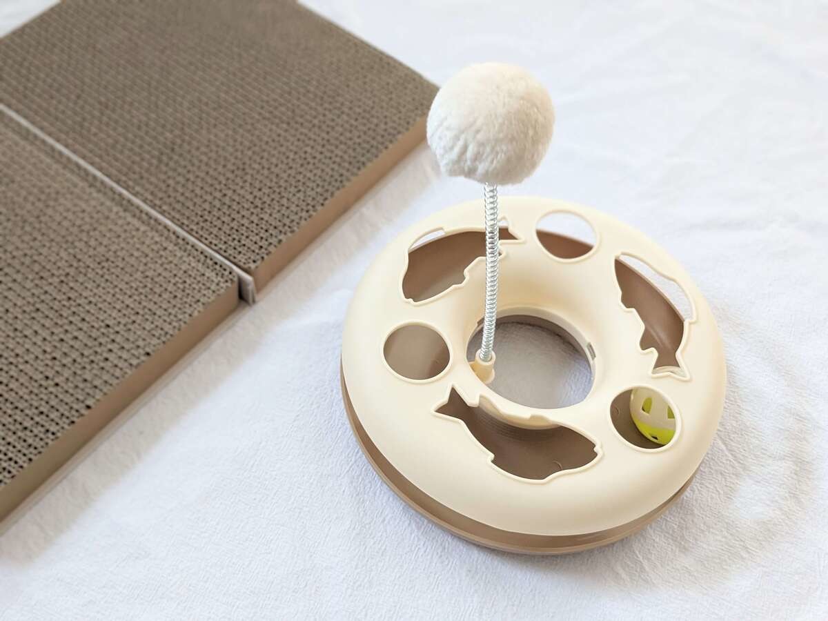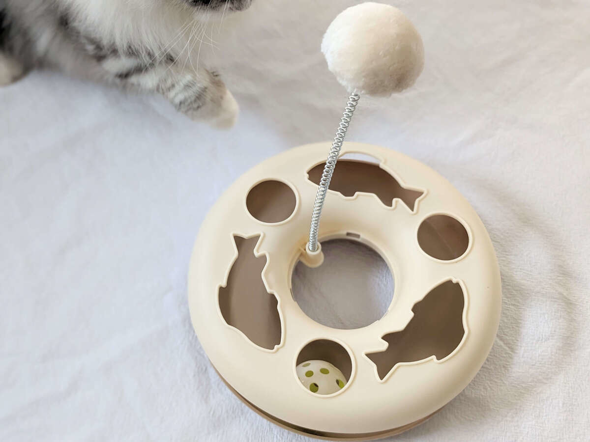 最後にご紹介するのは、夢中になって遊んでくれるペット用ぐるぐるボールおもちゃ。 キャットボールトイはすでに持っているのですが、今回はふわふわボール付きでまた違った遊び方を楽しめます。