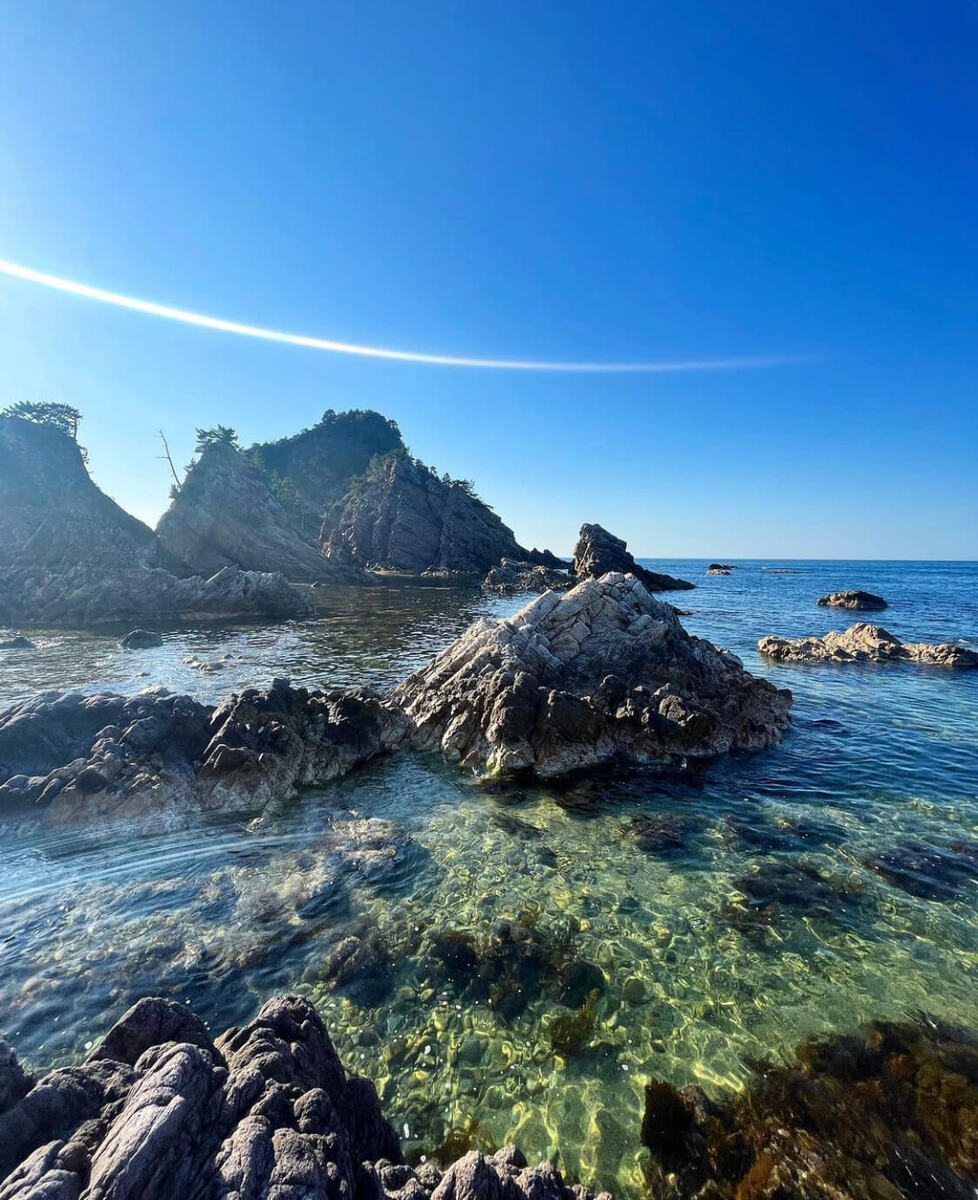 日本海の荒波によって削られて出来上がった岩場と、真っ青な日本海のコントラストは迫力満点!シュノーケリングで海に潜ると、コバンザメやアジの群れ、ウミウシなど、海の生き物に本当にたくさん出会えますよ。