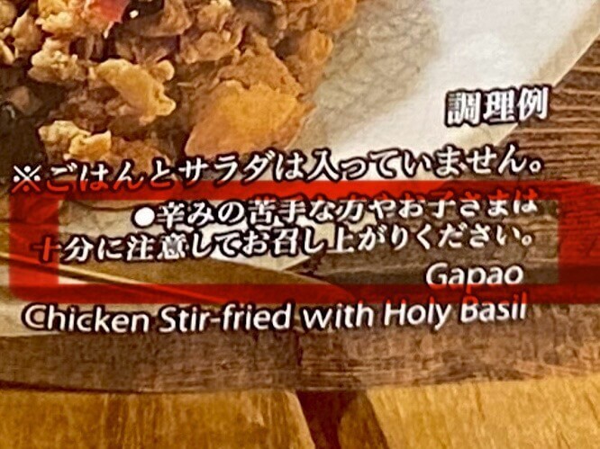 さて、イオン・トップバリュの「おうちで楽しむCaféごはん ガパオ」の味は、甘辛いというよりは辛甘いです。ほぼ全体が辛くて、すこしだけ甘みを感じるといった具合。 パッケージをよく見ると、右下に「辛みの苦手な方やお子さまは十分にご注意ください」と書いてありました。