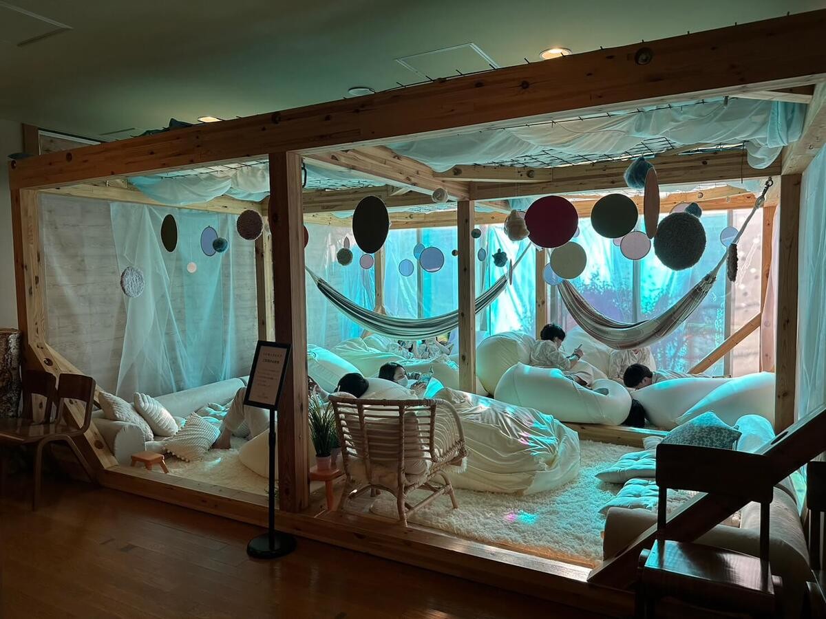 フリースペースにはソファや大型クッション、ハンモックもあり、漫画を読んだり昼寝したりと過ごし方は自由です。