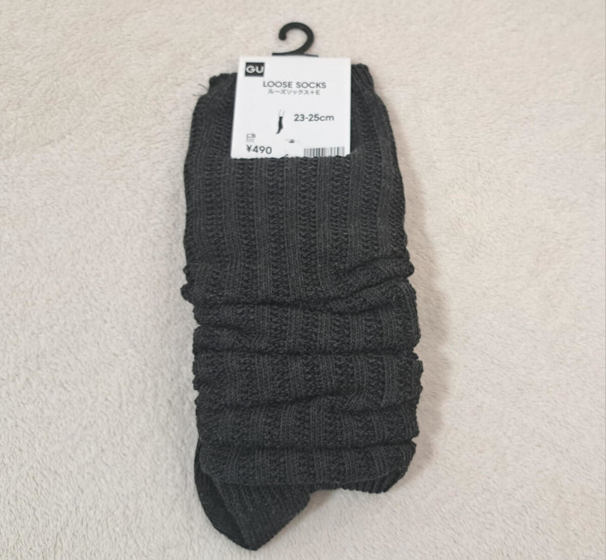GUの「ルーズソックス+E」は、1足で税込490円。価格的にはユニクロのものと差はほとんどありません。カラーはオフホワイト・ダークグレー・ブラック・ブラウン、サイズはワンサイズです。