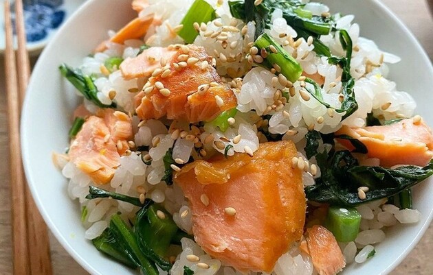 ごま油でさっと炒めた春菊と焼き鮭の塩気が絶妙にマッチした「焼き鮭と春菊の混ぜごはん」。