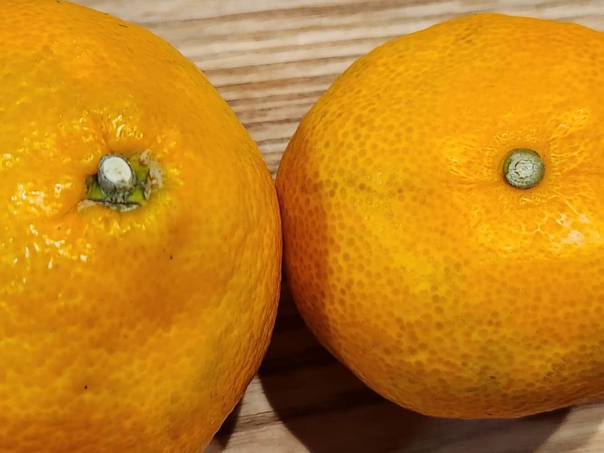 写真右のように「ヘタの切り口が小さい」みかんは、細い枝についていたものです。じっくりと時間をかけて成熟して甘味が強いことが多いと言われています。