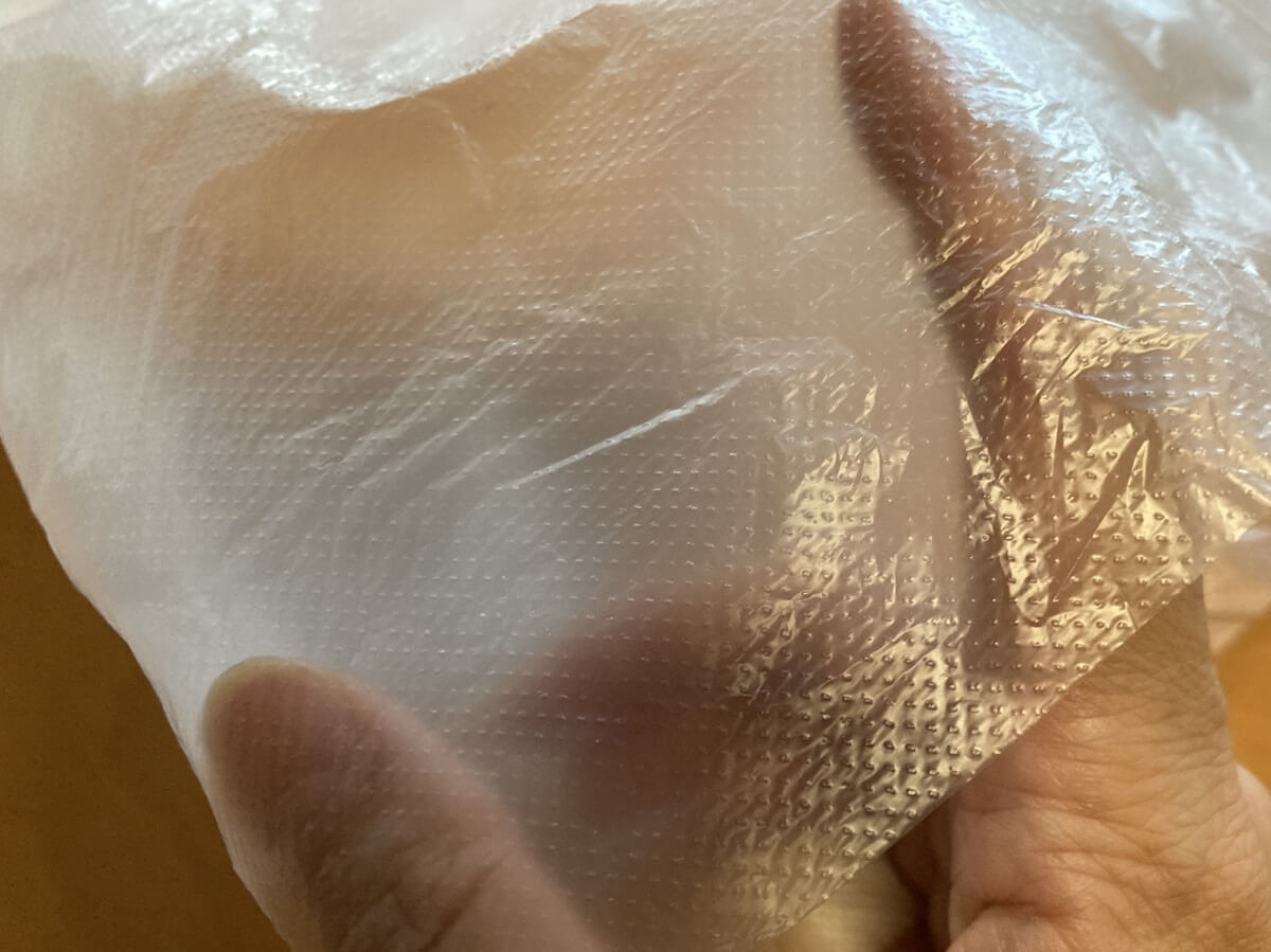ポリ袋の表面は凸凹していて、エンボス加工が施されているようです。