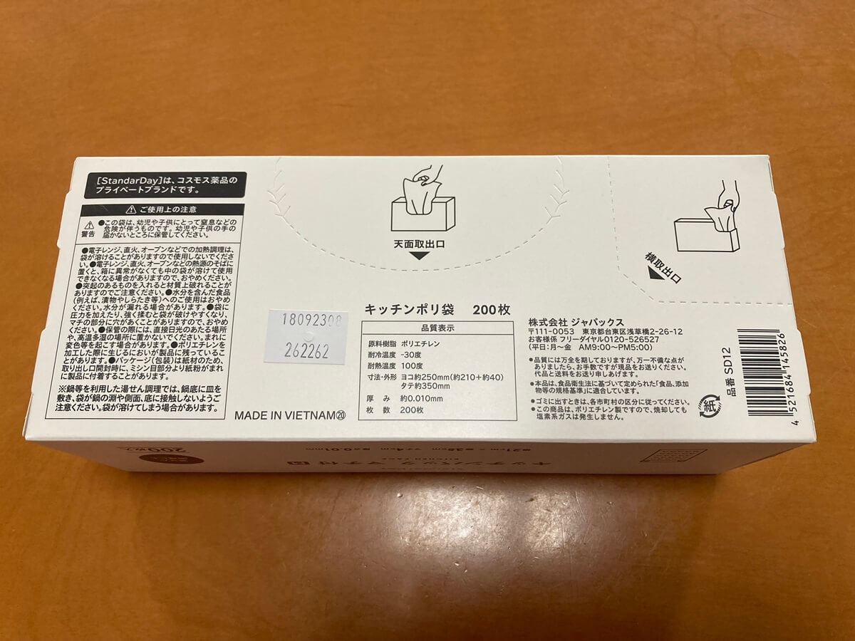 ▲キッチンパック マチ付き 21㎝×35㎝×4㎝ 200枚入 258円(税込)