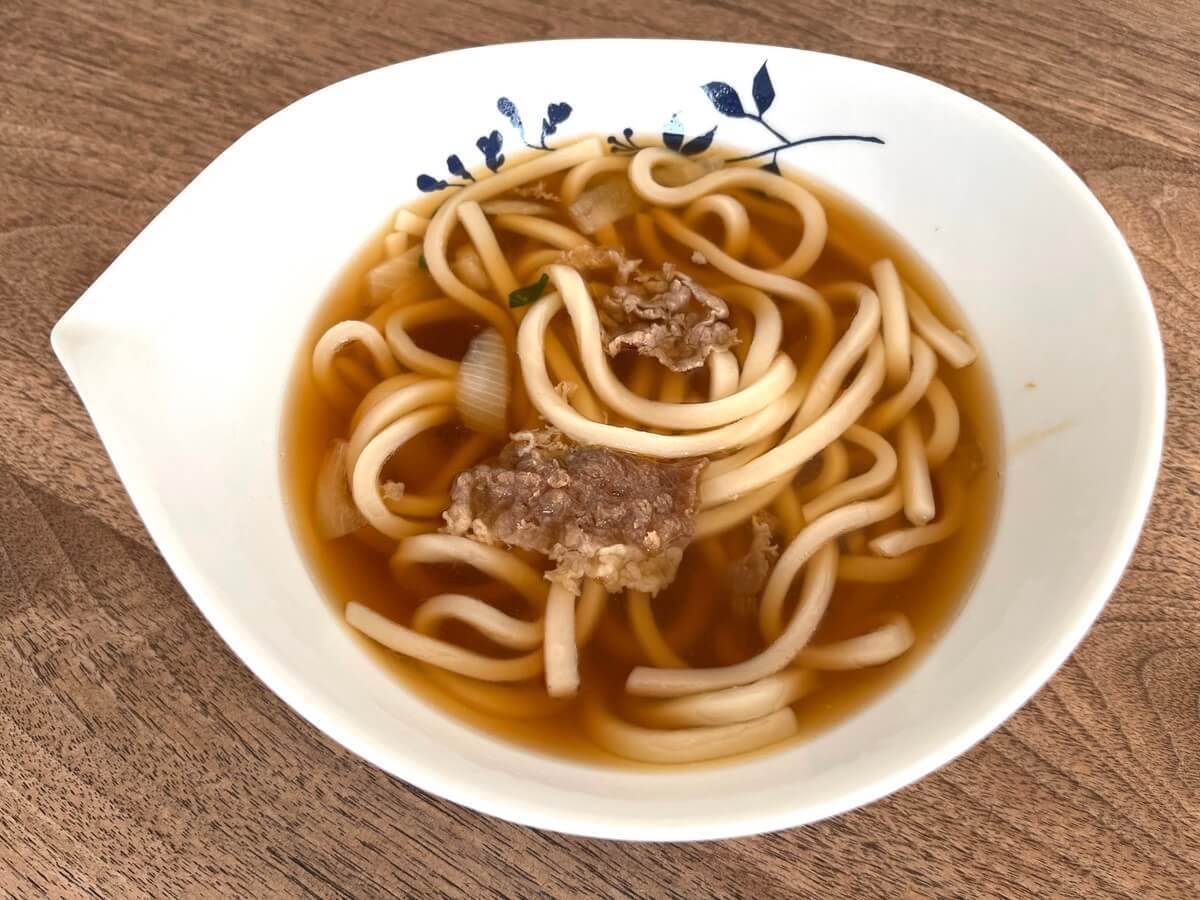 お湯を沸かしてから、電子レンジで麺と具剤を温めます。その間に、濃縮つゆとお湯を混ぜ、うどんつゆを作っておきます。そこへ、あたためられた麺と具剤を入れると、もう肉うどんの完成です。