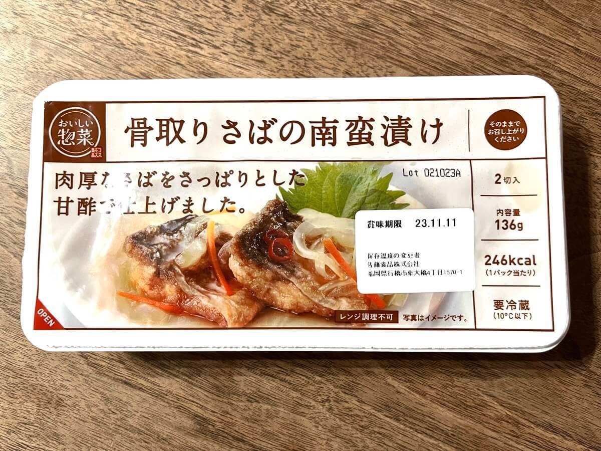 おいしい惣菜シリーズの中でも、1番手間がかからずおいしかった惣菜は「骨取りさばの南蛮漬け」です。南蛮漬けなので冷蔵庫から出して冷たいまま食べるのがおすすめ。さばだけでなく、玉ねぎと人参も南蛮酢に良く漬かっていて、ほんとにおいしい。