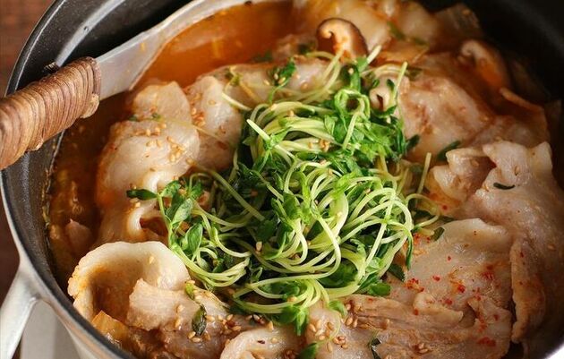 旨みたっぷりの豚バラ肉と豆苗のシャキシャキ食感がおいしい「旨辛!豆苗豚バラキムチ鍋」。