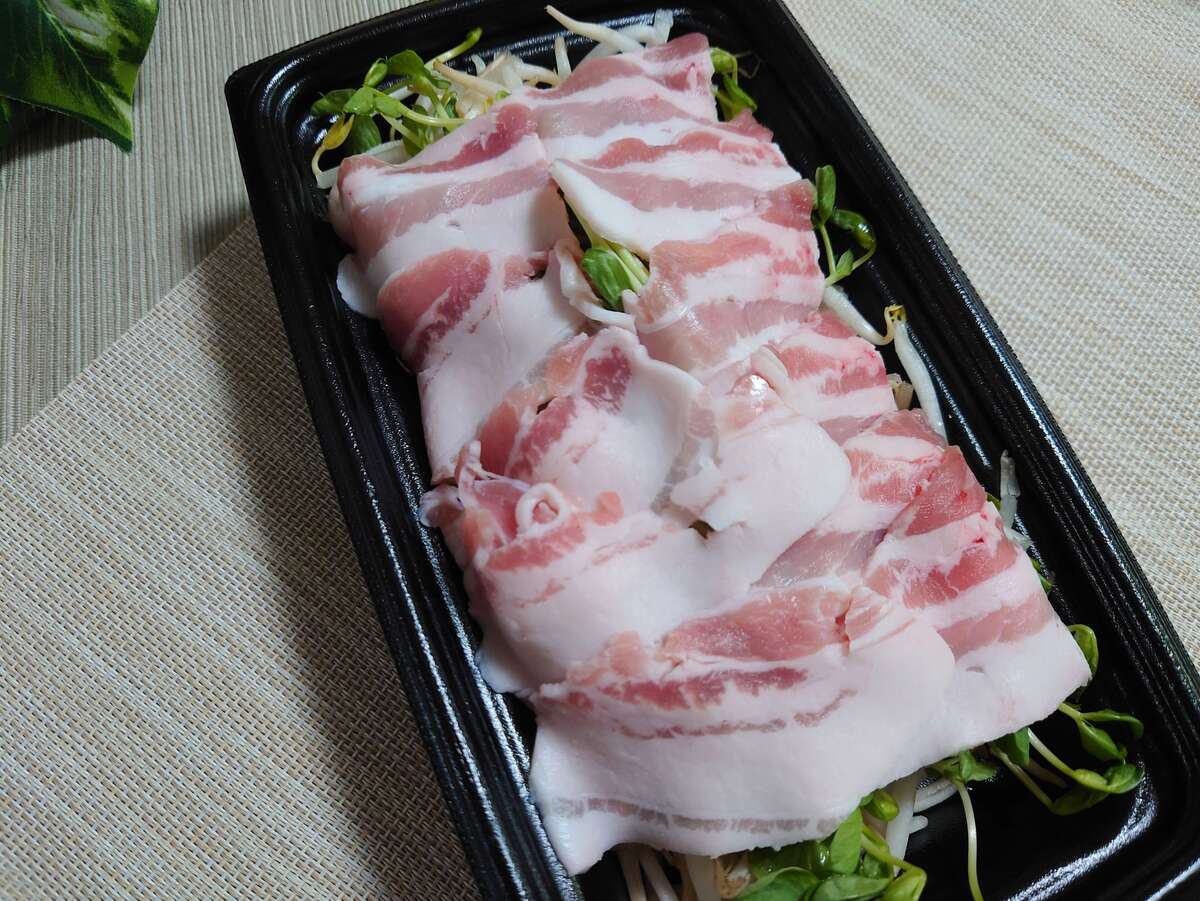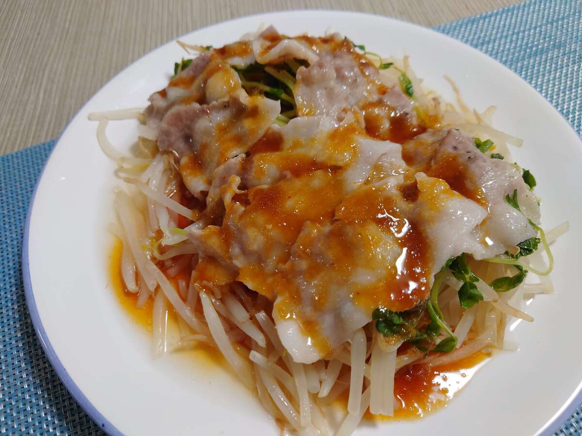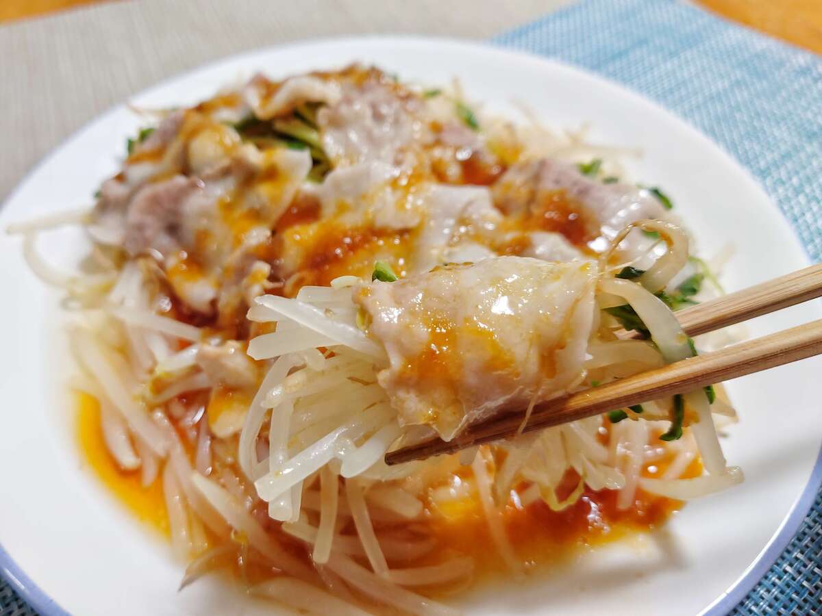 大量のもやしとカイワレ大根で、大量に野菜を摂取できて嬉しいです。ぜひ豚肉で野菜を巻いて食べて欲しい!