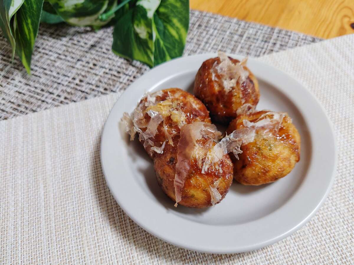 たこはコリコリで歯応えが良く、中はふわふわ・とろとろで、生地にあおさ、紅生姜、かつお出汁が入っていて、できたてに出会えてたら外はサクサクですが、冷めても最高においしい。あたためるとふわふわ感が増しましでそれはそれで絶品です。