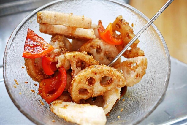 揚げている間に甘酢の材料を大きめのボウルに入れて混ぜ合わせておきましょう。残りのれんこんも同様に揚げ、パプリカと一緒に甘酢と和えます。