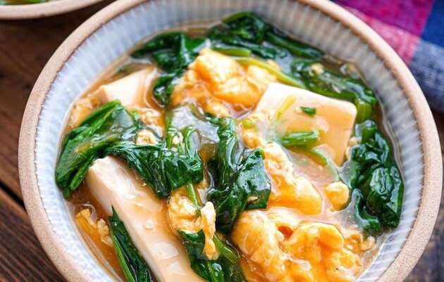 鉄分たっぷりのほうれん草と高タンパク低カロリーの豆腐をたっぷり味わえる、ほうれん草とふわとろ卵のとろみ豆腐。