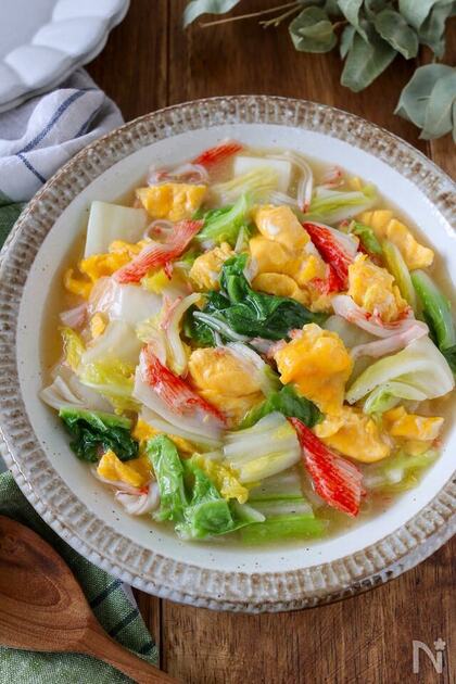 白菜とカニカマの旨みがとろりと溶け込んだあんかけ風おかず。コスパの良い食材で簡単に作れます。おろしにんにくと生姜入りなので体もぽかぽかに。やさしい味わいでカロリーは控えめです。