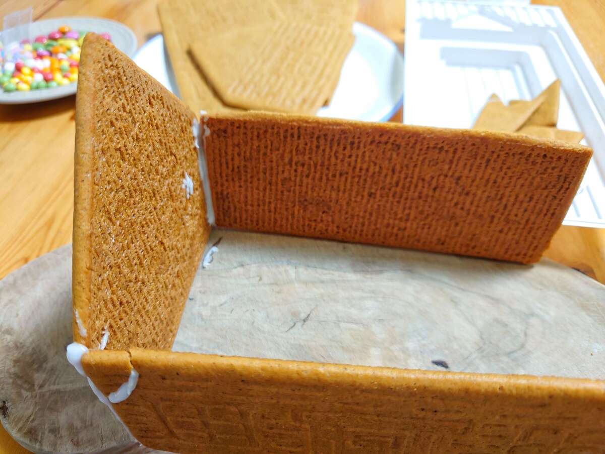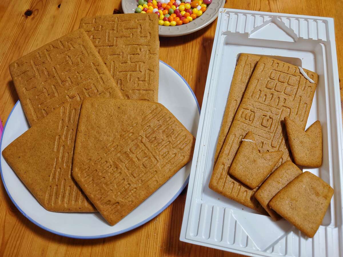 壁4枚、屋根2枚、煙突部分4枚のクッキーが入っています。開けた時に、すでに割れている箇所があったためアイシングで接ぎました。