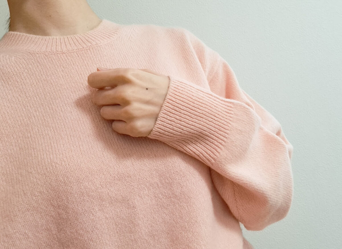 程よい厚みのセーターなので、春先まで着られそうです。冬場は厚手のヒートテックをインナーに着て、春先は薄手のインナーを合わせるとちょうど良さそう。ぜひ、桜色のシーズンに着こなしたいアイテムです。