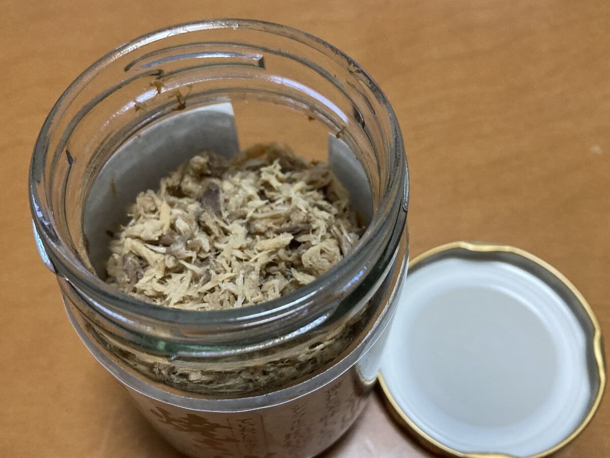 鮭の瓶詰はよく見かけますが、こちらはちょっと珍しい焼きサバのほぐし身です。金華山沖で獲れたサバを塩焼きにして手ほぐしされています。