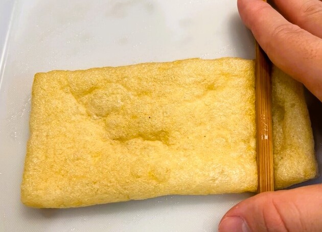 作り方①油揚げを箸でコロコロと転がして押し、半分に切る