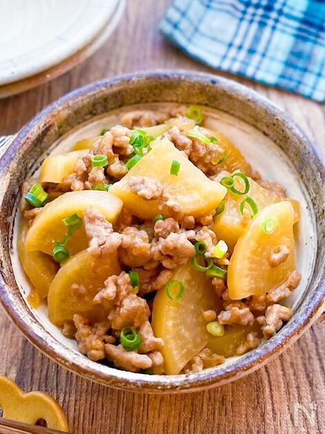 大根が5cmほど残っているときにおすすめのレシピ。大根をレンチンしてから豚ひき肉と炒め煮するので柔らかくてジューシー。生姜がふわっと香る甘辛醤油味でとろみ感があり、ご飯に良く合います。