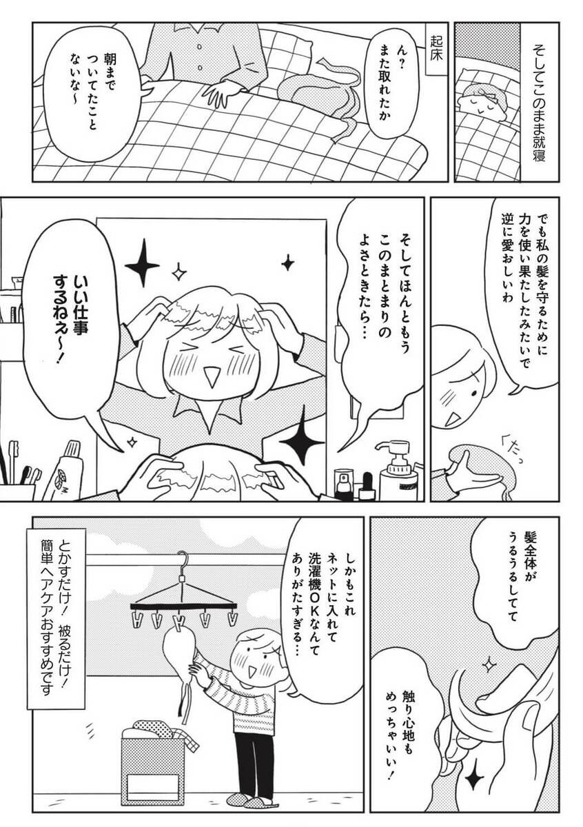 【漫画】とかすだけ!かぶるだけ!話題のヘアケアグッズで髪が早く乾く&寝グセ知らず【めんどくさがりやの自分の機嫌を取る暮らし④】