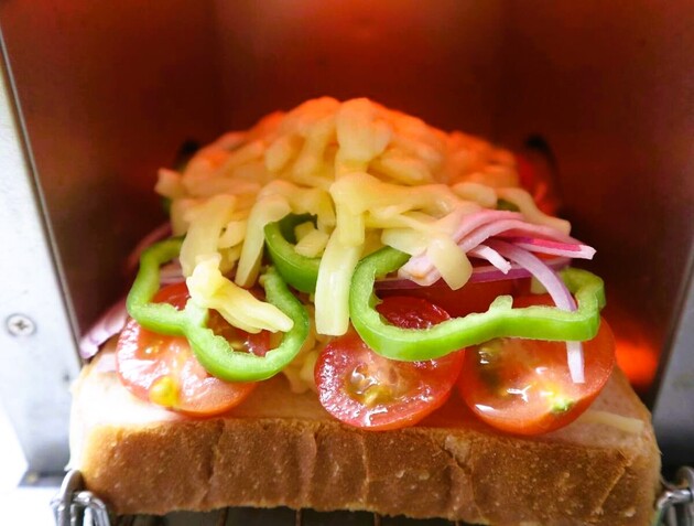 ②食パンにトマト、紫玉ねぎ、チーズ、ピーマンをのせて、分量外のとろけるチーズ(大さじ2ほど)をのせましょう。