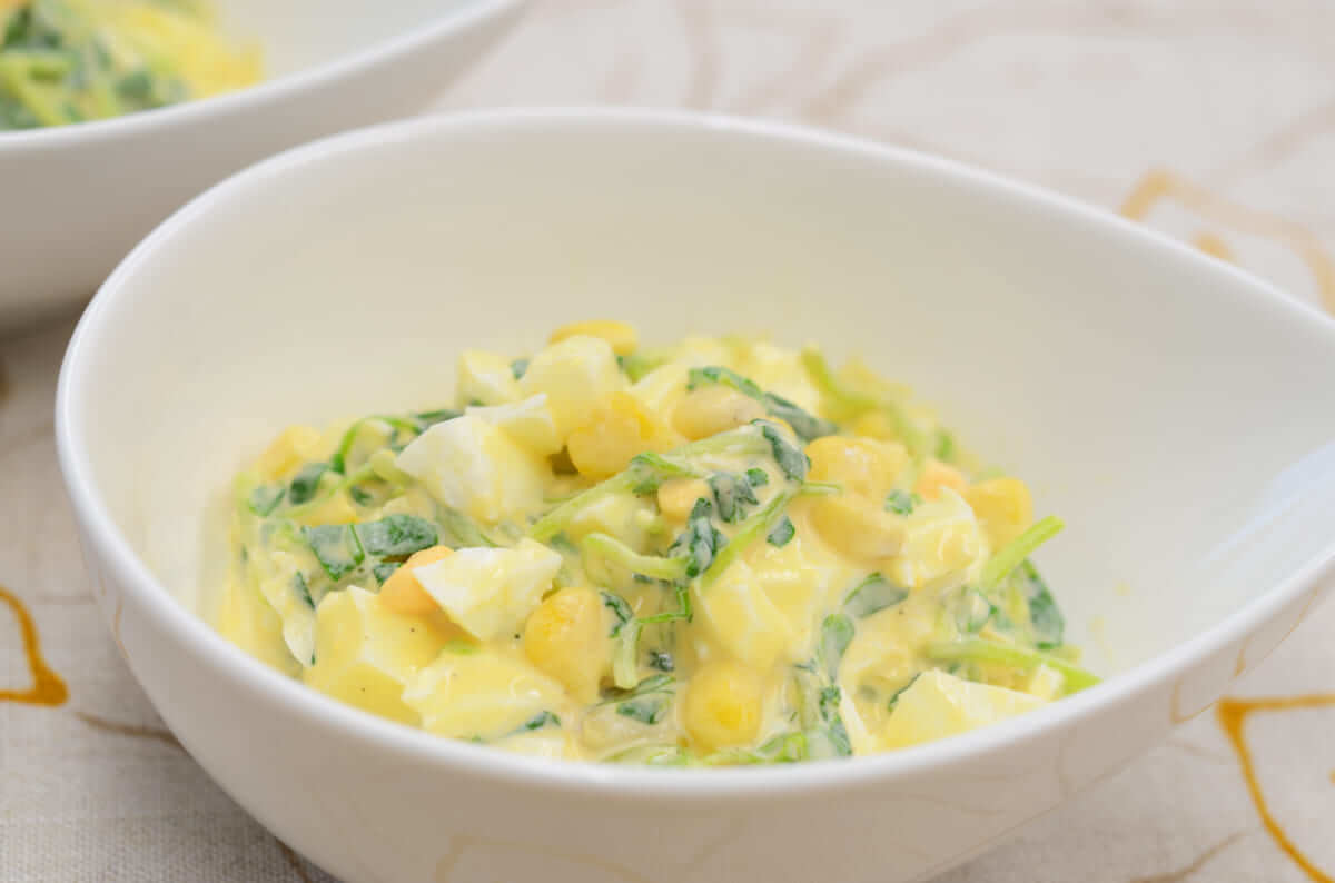 パンに合う豆苗アレンジ③豆苗たまコーンサラダ