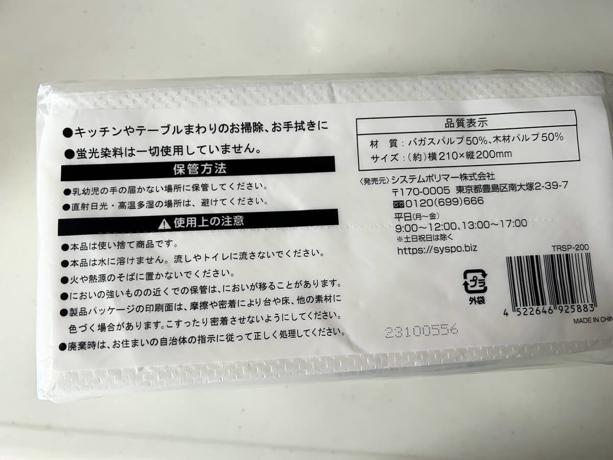パッケージの裏の表記には、蛍光染料は使っていません・キッチンやテーブルまわりのお掃除・お手拭きに、と記載がありました。