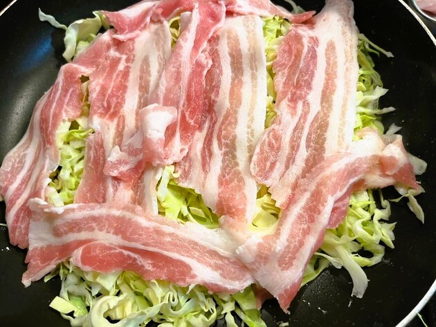 弱めの中火にして、2分間蒸し焼きに。その後豚肉をのせ、裏返しにして、フタをしてさらに2分間蒸し焼きに。