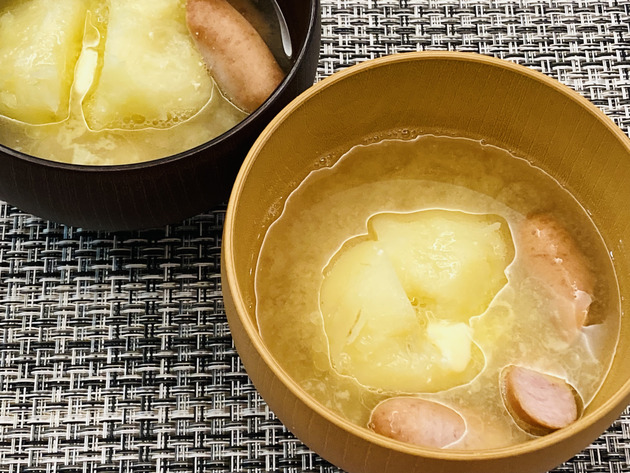 じゃがいもの粗熱がとれたら、皮を剥がしてお椀にいれてから②の味噌汁とソーセージを入れて、最後にバターをのせて完成!