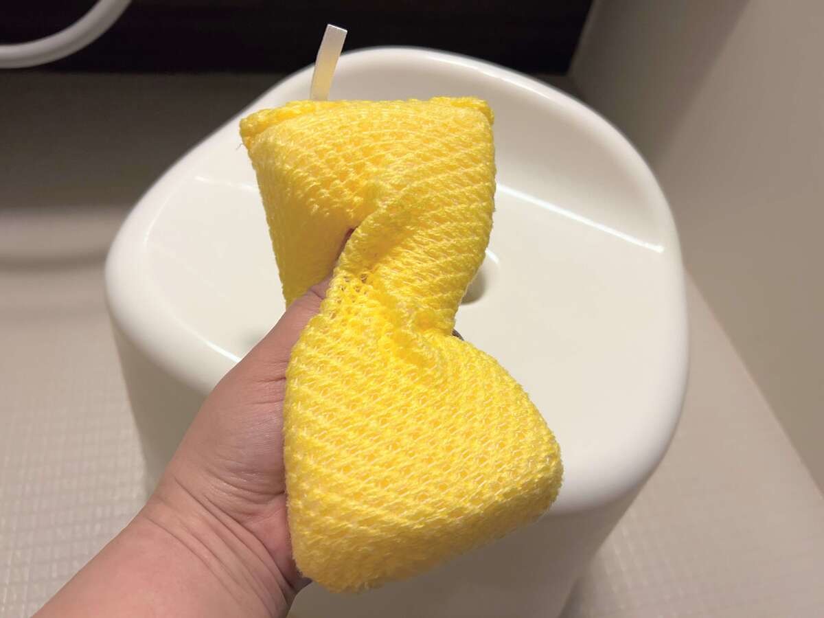 「アクリルネットバススポンジ」は、柔らかすぎず硬すぎず適度な弾力があります。ぎゅっとつかんで、狭いところや奥、椅子や洗面器などの小さなものも洗うことができます。