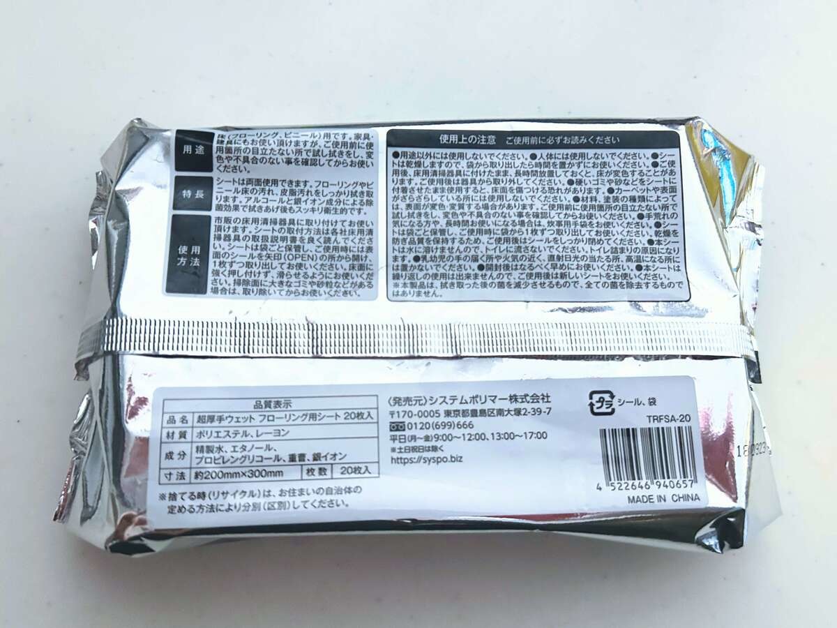 「99.9%除菌」の文字が目を惹くパッケージのこちらは、ウェットタイプのフローリングシートです。超厚手タイプでしっかり拭き取りができるとのこと。期待しながら購入しました。