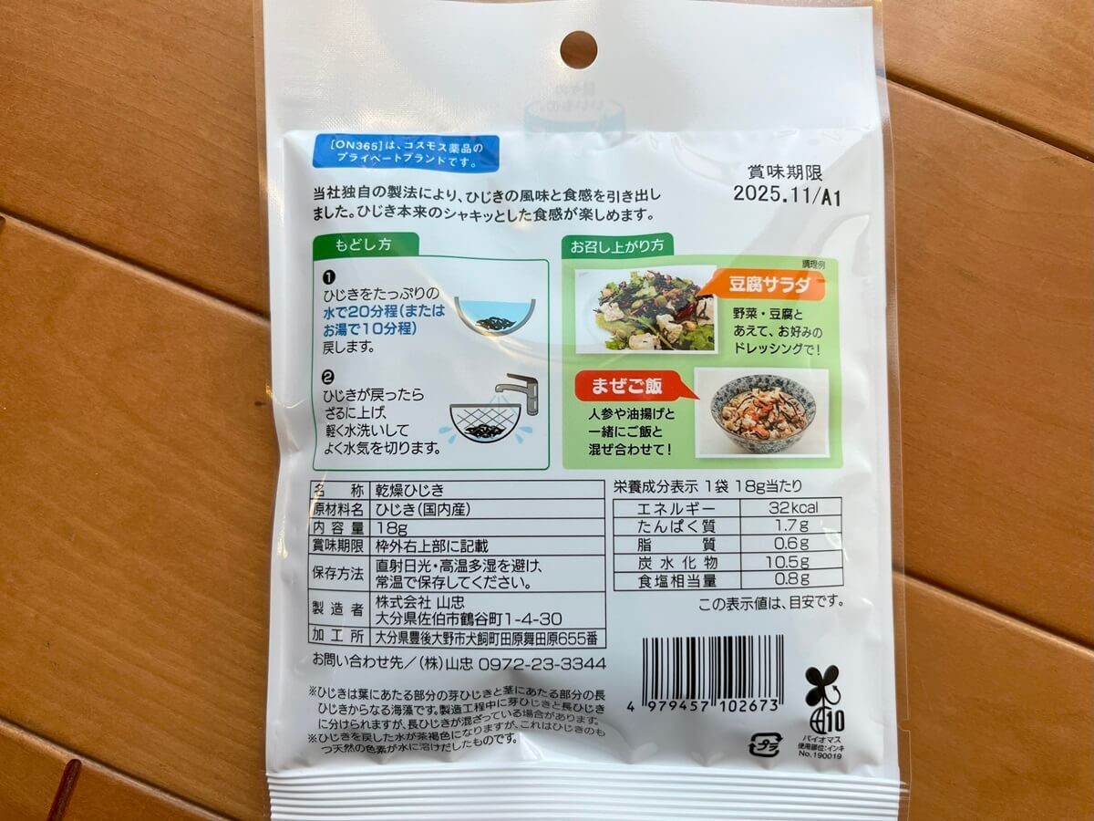 パッケージに「シャキッとした食感」と書かれているように、水で戻すとしっかりとした太さのあるひじきになります。かといって、固いわけではなく、海藻の食感を楽しむことができます。
