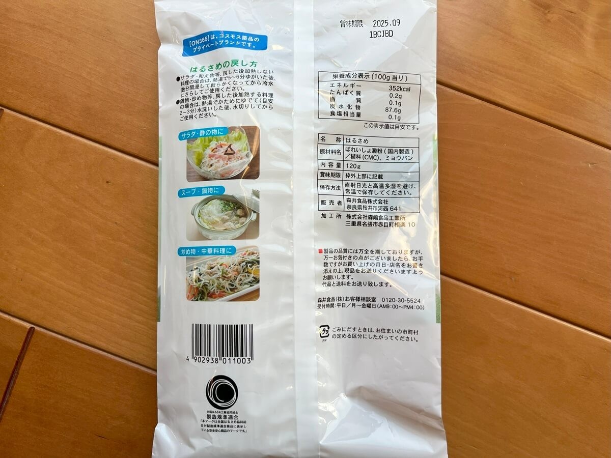 コスモスの春雨は、戻した時に割としっかりとした太さがあります。裏の表示通りにゆでると、ちょうどいい硬さになりました。