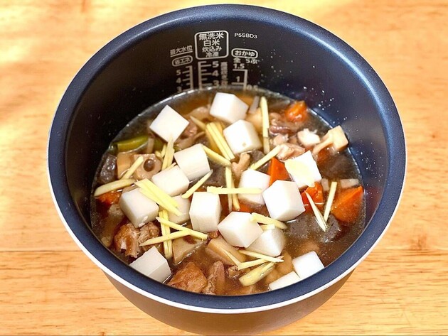 先ほど切っておいた筑前煮と餅、千切りにした生姜を炊飯釜に入れます。筑前煮の煮汁が一緒に入りそうな場合は、水を少しだけ減らしておいてくださいね。
