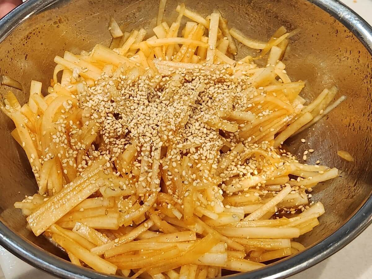 じゃがいもの芽をとり、皮を剥き、水に10分つけておきましょう。