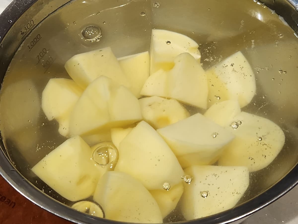②じゃがいもはレンチンするか下茹でして、箸がスッと刺さるやわらかさになるまで加熱する