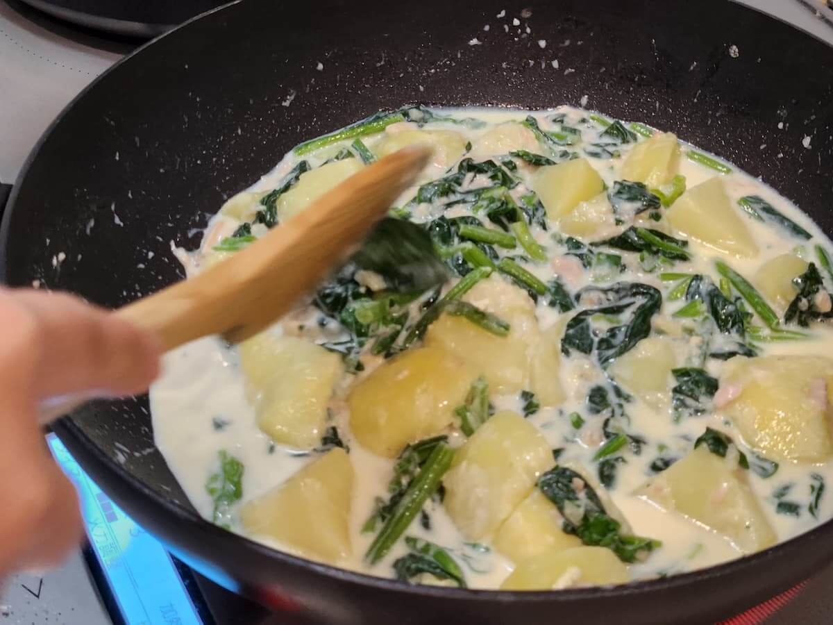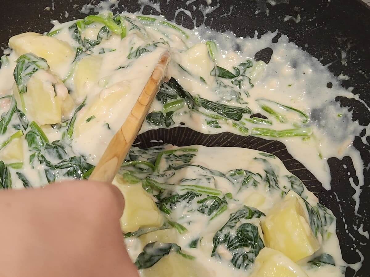④フライパンを加熱しバターを溶かし、ほうれん草・じゃがいも・ツナを入れて加熱する