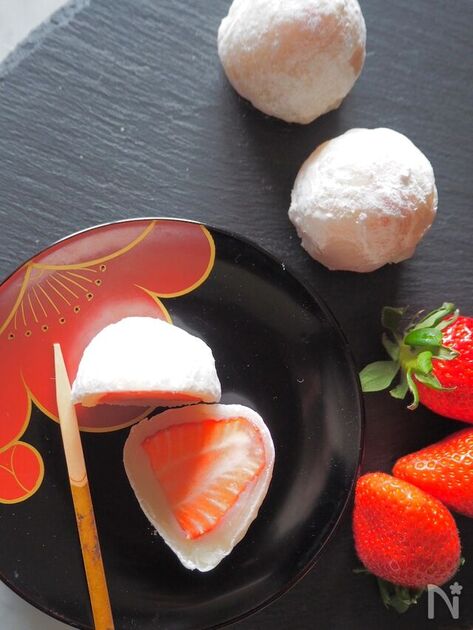 耐熱容器に切り餅と水、砂糖を入れて電子レンジで加熱し混ぜ合わせれば簡単に求肥のできあがり。市販のあんこを包むだけでお手軽に大福ができちゃいます。あんで包んだいちごを入れれば華やかさ満点のいちご大福に!